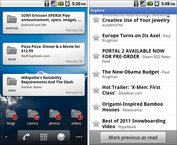 The Google Reader app is available for devices running Android 1.6 or higher, with widget functionality available for devices on Android 2.2+.