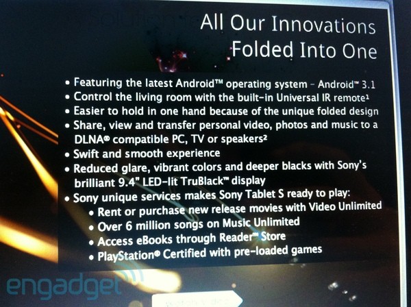 While the details were scarce till now about this Sony Honeycomb tablet, but now according to a leaked presentation, Tablet S will come with Android 3.1 with Ice Cream Sandwich upgradability, it will also have Infrared to control your TV and other devices directly from the tablet.