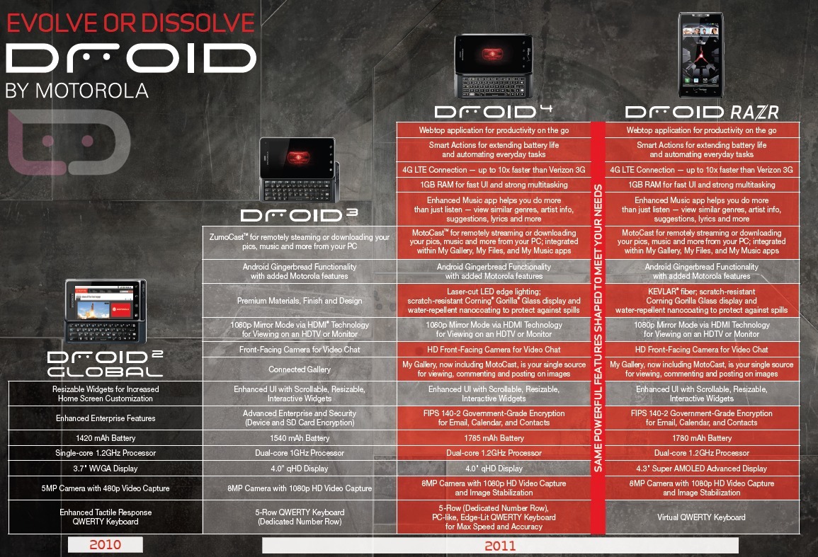 Droid 4 is expected to generate a lot of interest in QWERTY lovers, as they will be getting a Droid RAZR packed with slide-out keypad. We are for the official announcement for more details, till then check out one more press shot and evolution info-graphic below.