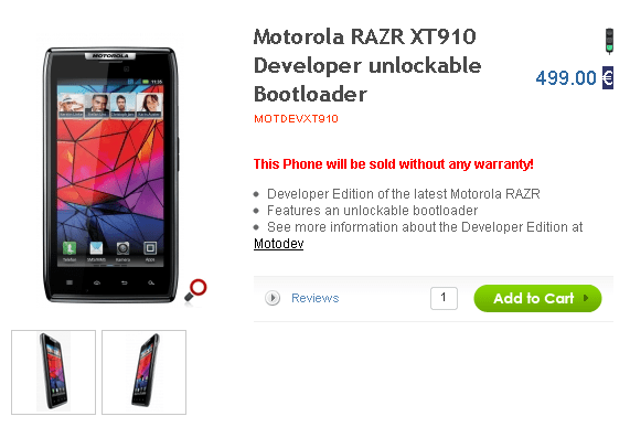 Prematurely outed earlier today, Motorola RAZR Developer Edition has been officially announced just now and can be pre-ordered by European developers. It has been priced at 499 Euros and comes with no warranty. Clearly not for everyone!
