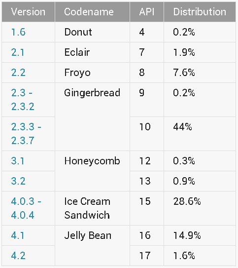 Android 4.1 and 4.2 are now present on 16.5 per cent of Android devices compared to 13.6 per cent a month ago. Android 4.0.x has gone down to 28.6 per cent of devices, while Gingerbread is no on 44.2 per cent.