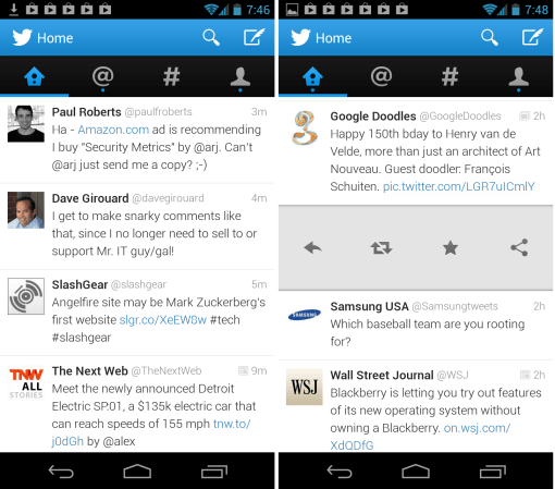 - We’ve got a brand new look and feel crafted for Android 4.0+. Navigate seamlessly between your favorite parts of Twitter with a simple swipe.