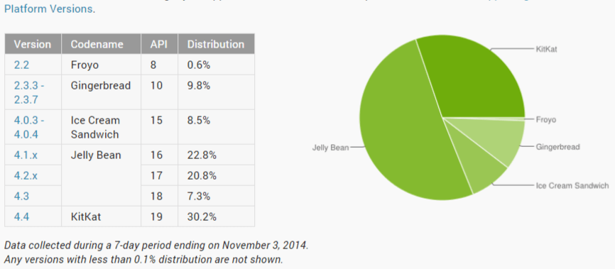 KitKat on its own has crossed the 30 percent mark and is expected to grow for the next few months. The latest Android version – Lollipop – might make an appearance in the platform distribution data next month but that will depend on the speed of Android 5.0 roll-out on Nexus devices and the sales of Nexus 9.