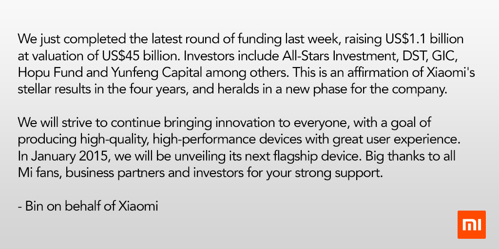 In addition to the funding news, Xiaomi shared that it is all set to introduce a new flagship device next month, which rumours indicate is going to be a large-screen smartphone. The phone is expected to feature a 5.7-inch QHD display, 20.7MP rear camera, 3GB of RAM, and Qualcomm Snapdragon 810 processor.